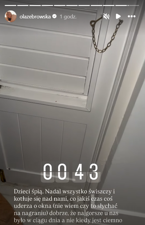 Aleksandra Żebrowska regularnie aktualizuje swoje InstaStories, dzieląc się nagraniami i opisami. Pokazała, jak spędzają czas po godzinie 17 lokalnego czasu, gdy wichura nasilała się.